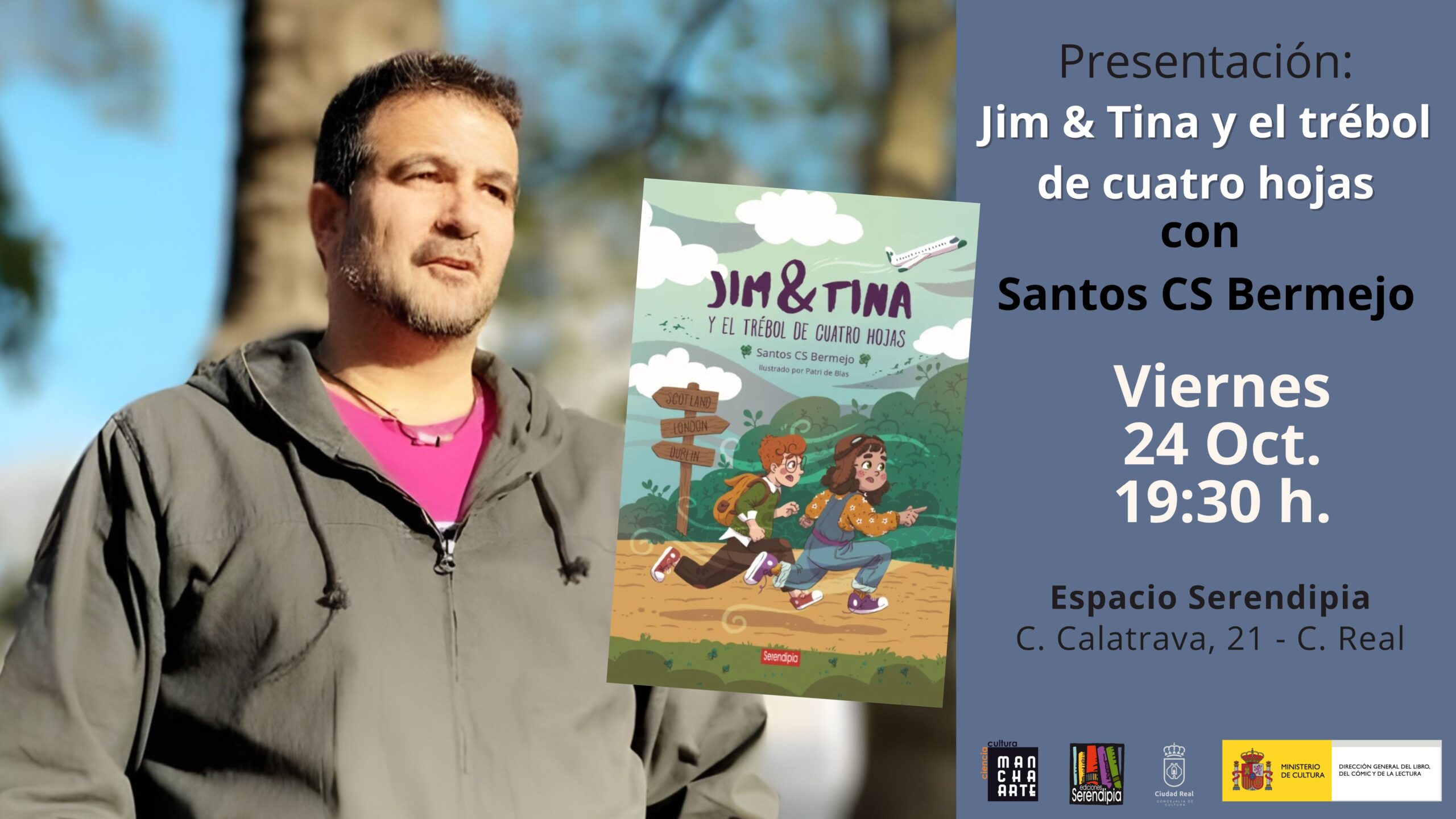 El viernes 24 de octubre a las 19:30 h., en el Espacio Serendipia, se presentará «Jim & Tina y el trébol de cuatro hojas» con Santos CS Bermejo